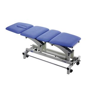 Lettino da manipolazione, visita e trattamenti regolabile idraulicamente o elettricamente in altezza mediante pedaliera a bassa tensione (24V) o con barra perimetrale. Lettino a tre sezioni mobili e una fissa con sistema di regolazione servoassistito da molle a gas. Il lettino può assumere le posizioni di seduta e Trendelenburg parziale, facilmente ottenibili anche con il paziente in carico. La testata è regolabile in positivo e negativo ed è dotata di foro naso-bocca con il tappo di serie.