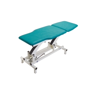 Table d'examen à deux sections, réglable en hauteur hydrauliquement ou électriquement via une pédale basse tension (24 V) ou une barre périphérique. La section têtière est équipée d'un système de réglage servo-assisté par vérin à gaz et d'une section fixe avec une section caudale plus étroite. La section têtière, large, peut également servir de dossier et est réglable en avant et en arrière. Elle est dépourvue d'ouverture pour la bouche et le nez.