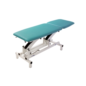 Table d'examen et de traitement à hauteur réglable hydrauliquement ou électriquement via un panneau de commande basse tension (24 V) ou une barre périphérique. La table comporte deux sections mobiles : la partie tête et la partie jambes sont assistées par vérins à gaz. La table se règle facilement en position de Trendelenburg, même avec un patient à bord. La grande section tête fait également office de dossier et est réglable en hauteur. Elle est dépourvue d'ouverture pour la bouche et le nez.